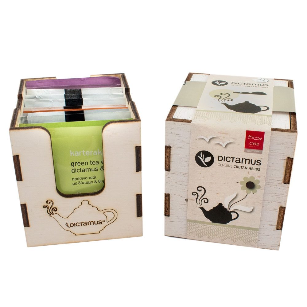 Kolekcjonerskie drewniane opakowanie zawiera łącznie 16 sztuk następujących kreteńskich ziół: Karteraki tradycyjny, Karteraki aromatyczny, Karteraki zielony, Luiza, szałwia, dyktamo, mięta, rumianek.